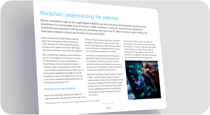 Blockchain: understanding the potential Bitcoin, heralded by many as the single biggest breathrough since the arrival of the internet, has proved to be something of a moving target since its launch in Š‹‹Œ Žowever, it continues to be the focus of significant investment and innovation with the industry predicting that more than $1 billion in venture capital funding will ’ have been invested in bitcoin and its future by the end of Š‹1‘ Recent developments include BitPesa, a Nairobi- clichés and misconceptions have grown up around „his may prove to be the case – but rather than based start-up focusing on bitcoin remittances, the digital currency and its underlying technology simply leaving it there, bans and companies could which raised over $1 million earlier this year and „hese misconceptions can hinder discussions about be delving into this topic to understand what maes Earthport which agreed a partnership with Ripple the future direction of development and the way in this technology so attractive and what types of abs allowing real-time cross-border ban payments which initiatives are presented in the media application could be created ˆt is only when the But, it is becoming increasingly clear that bitcoin is …or one thing, its associations with †il Road, the possibilities are e‰plored in more detail that the true part of an even bigger story financial institutions, digital blac maret, have left some people with scale of possible change can be appreciated including Barclays, are now considering how the assumption that bitcoin is lined to money the technology underpinning digital currency – laundering and terrorists Education is improving on commonly called ‘the blocchain’ or ‘blocchain’ this point, but misconceptions continue to affect the – could in itself revolutionise finance €hile many of way that many people thin about bitcoin these potential applications are medium term the Blocchain technology is liewise sub‡ect to certain development cycles in the industry mean that now clichés ˆn the first instance, attention focused is the time for companies to begin asing how this closely on bitcoin itself and how the digital currency technology could benefit them was going to change the world ˆn the last couple ‚hallenging the misconceptions of years, this focus has shifted and many people are now repeating the assertion that blocchain technologies are more interesting than Bitcoin Bitcoin may have attracted significant attention the currency around the world – but alongside all the hype, many ’ wwwinsidebitcoinscom“news“bitcoin-venture-capital-funding-pace-1-billion-Š‹1‘“”‹••‘ Š of ‘