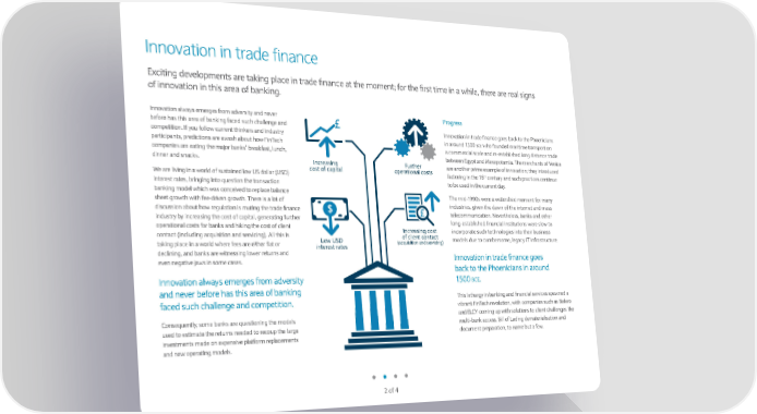 Innovation in trade finance …„citing developments are taking place in trade finance at the moment† for the first time in a while, there are real signs of innovation in this area of banking. Innovation always emerges from adversity and never ‰rogress before has this area of banking faced such challenge and competition. If you follow current thinkers and industry Innovation in trade finance goes back to the ‰hoenicians in around Š‹ŒŒ participants, predictions are awash about how FinTech bce who founded maritime transport on companies are eating the major banks’ breakfast, lunch, a commercial scale and re established long distance trade dinner and snacks. between …gypt and Žesopotamia. The merchants of ‘enice Increasing Further are another prime e„ample of innovation† they introduced cost of capital operational costs th We are living in a world of sustained low dollar factoring in the Š’ century and such practices continue interest rates, bringing into uestion the transaction to be used in the current day. banking model which was conceived to replace balance The mid Š““Œs were a watershed moment for many sheet growth with fee driven growth. There is a lot of industries, given the dawn of the internet and mass discussion about how regulation is muting the trade finance $ telecommunication. ”evertheless, banks and other industry by increasing the cost of capital, generating further long established financial institutions were slow to operational costs for banks and hiking the cost of client Increasing cost incorporate such technologies into their business contact including acuisition and servicing. €ll this is Low USD of client contact models due to cumbersome, legacy IT infrastructure. taking place in a world where fees are either flat or interest rates (acquisition and servicing) declining, and banks are witnessing lower returns and even negative jaws in some cases. Innovation in trade finance goes back to the ‰hoenicians in around Innovation always emerges from adversity bce. Š‹ŒŒ and never before has this area of banking faced such challenge and competition. This lethargy in banking and financial services spawned a vibrant FinTech revolution, with companies such as •olero ƒonseuently, some banks are uestioning the models and …–ƒ— coming up with solutions to client challenges like used to estimate the returns needed to recoup the large multi bank access, •ill of –ading dematerialisation and investments made on e„pensive platform replacements document preparation, to name but a few. and new operating models. ‡ of ˆ