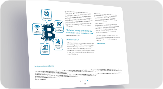 ›ur clients are demanding deep digital integration in a cost •arclays is also a member of the infrastructure protocol effective manner. This is critical if we as banks are to address initiative ‘¡™ƒ…‘’, alongside other financial institutions. our cost of service, especially in our small and medium si¤e The members of this initiative will build and adopt a enterprise Ž… segment. €t the other end of the spectrum, common infrastructure to support a distributed ledger Transparency many large or multinational corporate clients are multi banked among financial institutions. and are probably averse to using multiple standards and interfaces to send and receive information to and from their The ¡™ƒ…‘ initiative manages a private, peer to peer banks. •lockchain technology can offer solutions to these distributed ledger, underpinned by …thereum technology challenges too. and hosted on a virtual private network ‘‰” in Traceability Žicrosoft €¤ure the public cloud platform offering and “•lockchain is a very good solution to •lockchain as a ervice •aa in an accelerated provenance development environment. Digital eliminate the pain in international trade.” uniqueness €fter such a long period of ‘business as usual’ within Gadi Ruschin, Founder, Wave trade finance, it will be interesting to see how distributed ledger technology shapes the banking industry of o what are we doing¥ the future. €t •arclays, through our €ccelerator programme, we have Watch this space… Reduction in been mentoring a number of start up companies in order operational to share our knowledge and e„pertise and also to learn costs from them. In the Trade and Working ƒapital team Elimination specifically, we are partnering with a company called Wave of fraud in order to use their solution for dematerialising the trade finance •ill of –ading. barclays.com£corporatebanking …very attempt has been made to ensure that the information provided is accurate. œowever, neither •arclays •ank ‰–ƒ “•arclays” nor any of its employees makes any representation or warranty e„press or implied in relation to the accuracy, reliability or completeness of any information or assumptions on which this document may be based and cannot be held responsible for any errors. ”o liability is accepted by •arclays or any of its affiliates for any loss whether direct or indirect arising from the use of the information provided. •arclays is a trading name of •arclays •ank ‰–ƒ and its subsidiaries. •arclays •ank ‰–ƒ is authorised by the ‰rudential ¡egulation €uthority and regulated by the Financial ƒonduct €uthority and the ‰rudential ¡egulation €uthority Financial ervices ¡egister ”o. Ї‡¢Œ‡. ¡egistered in …ngland. ¡egistered number is ŠŒ‡’Š’¢ with registered office at Š ƒhurchill ‰lace, –ondon …Šˆ ‹œ‰. February ‡ŒŠ’. •ŒŠ’Š¢. ˆ of ˆ