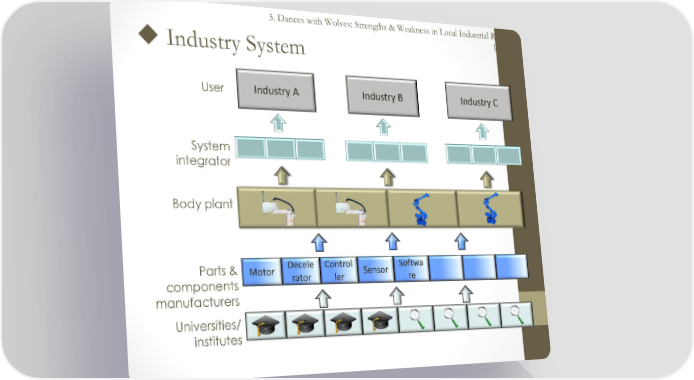 3. Dances with Wolves: Strengths & Weakness in Local Industrial Robotics Industry System Industry User Industry A Industry B Industry C System integrator Body plant Parts & Motor Decele Control Sensor Softwa components rator ler re manufacturers Universities/ institutes