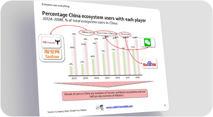 Everyone uses everything Percentage China ecosystem users with each player 2012A-2018E, % of total ecosystem users in China Alibaba Users Tencent Users (China only) Baidu Users 91% 90% 91% 89% 89% 88% 90% 82% 85% 86% 81% 69% 71% 61% 65% 60% 57% 53% 40% 27% 22% 2012A 2013A 2014A 2015A 2016E 2017E 2018E Almost all users in China are members of Tencent and Baidu’s ecosystems and over half are also members of Alibaba’s. SSoouurrcece:: Company Data, Radio Free Mobile www.radiofreemobile.com 15