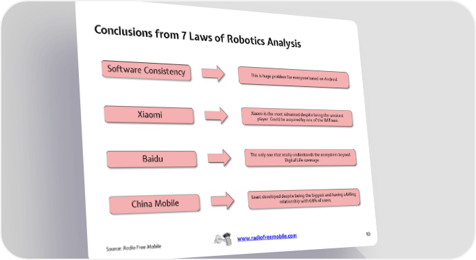 Conclusions from 7 Laws of Robotics Analysis Software Consistency This is huge problem for everyone based on Android Xiaomi Xiaomi is the most advanced despite being the weakest player. Could be acquired by one of the BATmen. Baidu The only one that really understands the ecosystem beyond Digital Life coverage. China Mobile Least developed despite being the biggest and having a billing relationship with 68% of users. SSoouurrcece:: Radio Free Mobile www.radiofreemobile.com 10