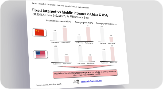Access : Mobile is the primary choice for users in China, in contrast to USA Fixed Internet vs Mobile Internet in China & USA Q1 2016A, Users (m), MBPS, %, Milliseconds (ms) % connections over 4MBPS Average speed MBPS Average page load time ms 4.7 2661 63% 41% 4.1 2426 Fixed Internet Mobile Internet Fixed Internet Mobile Internet Fixed Internet Mobile Internet 83% 14.2 3559 2564 35% 4.8 Fixed Internet Mobile Internet Fixed Internet Mobile Internet Fixed Internet Mobile Internet Mobile broadband in China has greater penetration, is faster on average with lower latency than fixed. Opposite to USA. Source: Akamai, Radio Free Mobile www.radiofreemobile.com