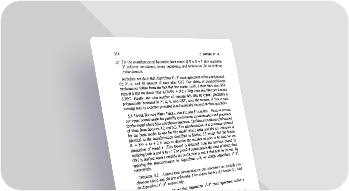 314 C. DWORK ET AL. (c) For the unauthenticated Byzantine fault model, ifN I 3t + 1, then Algorithm 33 achieves consistency, strong unanimity, and termination for an arbitrary value domain. As before, we claim that Algorithms 13-33 reach agreement within a polynomial (in N, A, and a) amount of time after GST. Our claims of polynomial-time performance follow from the fact that the master clock, a short time after GST, runs at a rate no slower than 1/(24NQ + 3(A + 39)) times real time (see Lemma 5.7(b)). Finally, the total number of message bits sent by correct processors is polynomially bounded in N, A, a’, and GST, since the number of bits in each message sent by a correct processor is polynomially bounded in these quantities. 5.4 UPPERBOUNDSWHEN DELTA ANDPHIAREUNKNOWN. Next,wepresent our upper bound results for partially synchronous communication and processors, for the model where delta and phi are unknown. The ideas are a simple combination of ideas from Sections 4.2 and 5.3. The transformation of a consensus protocol for the basic model to one for the model where delta and phi are unknown is identical to the transformation described in Section 5.3 except that the bound R, = 3Nr + 8r + 2 is used to describe the number of ticks to be used for the simulation of round r. (This bound is obtained from the previous bound by replacing both A and Q, by r.) The proof of correctness is the same as before, since GST is reached when r exceeds the (unknown) A and @ that hold in the run. By applying this transformation to Algorithms l-3, we obtain Algorithms 14-34, respectively. THEOREM 5.2. Assume that communication and processors are partially syn- chronous (delta and phi are unknown). Then claims (a)-(c) of Theorem 5.1 hold for Algorithms 1 4-3 4, respectively. As before, it is easy to see that Algorithms 14-34 reach agreement within a polynomial (in N, A, and a) amount of time. Remark 5. In the simulation of the basic model described in Sections 5.3 and 5.4, if the round number of processor p;s last algorithm simulation step was h and processor pi updates its clock and finds that it is now simulating some round k > h, then all state transitions in rounds h through k - 1 are simulated (except that no messages are sent). For a general simulation of the basic model, these transitions must all be simulated, since they may involve state transitions that processor pi must make in order that the simulation of the algorithm in the basic model be correct. However, it is not hard to see that, for the particular Algorithms l-3 designed for the basic model in Section 3.2, processor pi can just simulate the state transition for round h and continue the simulation at round k, without simulating the “missed” transitions in rounds h + 1 through k - 1. This can be done since the state information in Algorithms l-3 (not including the current round number) consists of the PROPER sets, the values which are locked, and other information associated with each lock. Changes in this state information are caused only by the receipt of certain messages. Since we have shown consistency for Algorithms l-3 even if messages are lost before GST, it follows that the algorithms remain consistent if processors, including correct ones, skip state transitions before GST. 6. Partially Synchronous Processors and Synchronous Communication In this section we consider models where processors are partially synchronous and communication is synchronous; that is, there is a fixed upper bound A on message