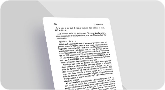 298 C. DWORK ET AL. It is easy to see that all correct processors make decisions by round GST + 4(N + 1). 3.2.2 Byzantine Faults with Authentication. The second algorithm achieves strong unanimity for an arbitrary value set I’, in the case of Byzantine faults with authentication. Algorithm 2. N 2 3t + 1 Initially, each processor’s PROPER set contains just its own initial value. Each processor attaches its PROPER set and its initial value to every message it sends. If a processor p ever receives 2t + 1 initial values from different processors, among which there are not t + 1 with the same value, then p puts all of V (the total value domain) into its PROPER set. (Of course, p would actually just set a bit indicating that PROPER contains all of V.) When a processor p receives claims from at least t + 1 other processors that a particular value v is in their PROPER sets, then p puts v into its own PROPER set. It is not difficult to check that each PROPER set for a correct processor always contains only proper values. Processing is again divided into alternating trying and lock-release phases, with phases numbered as before and of the same length as before. At various times during the algorithm, processors may lock values. In Algorithm 2, not only is a phase number associated with every lock, but also a proof of acceptability of the locked value, in the form of a set of signed messages, sent by N - t processors, saying that the locked value is acceptable and in their PROPER sets at the beginning of the given phase. A value v is acceptable to p if p does not have a lock on any value except possibly v. We now describe the processing during a particular trying phase k. Let s = 4k - 3 be the first round of phase k, and assume k = i mod N. At round s, each processor pj (including pi) sends a list of all its acceptable values that are also in its PROPER set to processor pi, in the form Ej(list, k), where Ej is an authentication function. Just after round S, processor pi attempts to choose a value to propose. In order for processor pi to propose v, it must have heard that at least N - t processors find value v acceptable and proper at phase k. Again, if there is more than one possible value that processor pi might propose, then it will choose one arbitrarily. Processor pi then broadcasts a message Ei(lock v, k, proof), where the proof consists of the set of signed messages Ej(list, k) received from the N - t processors that found v acceptable and proper. If any processor receives an Ei(lock v, k, proof) message at round s + 1, it decodes the proof to check that N - t processors find v acceptable and proper at phase k. If the proof is valid, it locks v, associating the phase number k and the message Ej(lock v, k, proof) with the lock, and sends an acknowledgment to processor pi. In this case any earlier lock on v is released. (Any locks on other values are not released at this time.) If the processor should receive such messages for more than one value v, it handles each one similarly. The entire message Ei(lOck v, k, proof) is said to be a valid lock on v at phase k. If processor pi receives acknowledgments from at least 2t + 1 processors, then processor pi decides v. After deciding v, processor pi continues to participate in the algorithm. Lock-release phase k occurs at round s + 3 = 4k. Processors broadcast messages of the form Ei(lock v, h, proof), indicating that the sender has a lock on v with associated phase h and the given associated proof, and that processor pi sent the message at phase h, which caused the lock to be placed. If any processor has a lock on some value v with associated phase h and receives a properly signed message