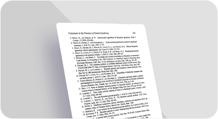 Consensus in the Presence of Partial Synchrony 323 3. DOLEV, D., AND STRONG, H. R. Authenticated algorithms for Byzantine agreement. SIAM J. Comput. 12 (1983), 656-666. 4. DOLEV, D., DWORK, C., AND STOCKMEYER, L. On the minimal synchronism needed for distributed consensus. J. ACM34, 1 (Jan. 1987), 77-97. 5. DOLEV, D., FISCHER, M. J., FOWLER, R., LYNCH, N. A., AND STRONG, H. R. Efficient Byzantine agreement without authentication. I& Control 52 (1982), 257-274. 6. DOLEV, D., LYNCH, N. A., PINTER, S. S., STARK, E. W., AND WEIHL, W. E. Reaching approximate agreement in the presence of faults. J. ACM 33, 3 (July 1986), 499-5 16. 7. DWORK, C., AND Mosm, Y. Knowledge and common knowledge in a Byzantine environment I: Crash failures. In Proceedings of the 1986 Conference on Theoretical Aspects of Reasoning about Knowledge (Monterey, Calif., Mar. 19-22). Kaufmann, Los Altos, Calif., 1986, pp. 149-169. 8. FISCHER, M. J. The consensus problem in unreliable distributed systems (a brief survey). Rep. YALEU/DSC/RR-273. Dept. of Computer Science, Yale Univ., New Haven, Conn., June 1983. 9. FISCHER, M. J., AND LAMPORT, L. Byzantine generals and transaction commit protocols. Tech. Rep. Gp. 62, SRI International, Menlo Park, Calif., 1982. 10. FISCHER, M. J., LYNCH, N. A., AND PATERSON, M. S. Impossibility of distributed consensus with one faulty process. J. ACM 32,2 (Apr. 1985), 374-382. 11. GARCIA-M• LINA, H., P~T~ELLI, F., AND DAVIDSON, S. Is Byzantine agreement useful in a distrib- uted database? In Proceedings of the 3rd SIGACT-SIGMOD Symposium on Principles of Database Systems (Waterloo, Ont., Canada, Apr. 2-4). ACM, New York, 1984, pp. 6 l-69. 12. GRAY, J. N. Notes on database operating systems. In Operating Systems: An Advanced Course. Lecture Notes in Computer Science, vol. 60. Springer-Verlag, New York, 1978, pp. 393-481. 13. LAMPORT, L. Time, clocks, and the ordering of events in a distributed system. Commun. ACM 21, 7 (July 1978), 558-565. 14. LAMPORT, L. The weak Byzantine generals problem. J. ACM 30, 3 (July 1983), 668-676. 15. LAMPORT, L., SHOSTAK, R., AND PEASE, M. The Byzantine generals problem. ACM Trans. Program. Lang. Syst. 4, 3 (July 1982), 382-401. 16. PINTER, S. Distributed computation systems: Modelling, verification and algorithms. Ph.D. dis- sertation. Dept. of Computer Science, Boston Univ., Boston, Mass., 1984. 17. REISCHUK, R. A new solution for the Byzantine generals problem. ZnJ Control 64 (1985), 23-42. 18. SCHNEIDER, F. B. Byzantine generals in action: Implementing fail-stop processors. ACM Trans. Comput. Syst. 2, 2 (May 1984), 145-154. 19. SKEEN, D. A quorum based commit protocol. Tech. Rep. TR 82-483, Computer Science Dept., Cornell Univ., Ithaca, N.Y., Feb. 1982. 20. SRIKANTH, T. K., AND TOUEC, S. Simulating authenticated broadcasts to derive simple fault- tolerant algorithms. Rep. 84-623, Computer Science Dept., Cornell Univ., Ithaca, N.Y., 1984. RECEIVED OCTOBER 1985; REVISED JULY 1986 AND MARCH 1987; ACCEPTED MARCH 1987 Journal of the Association for Computing Machinery, Vol. 35, No. 2, April 1988.
