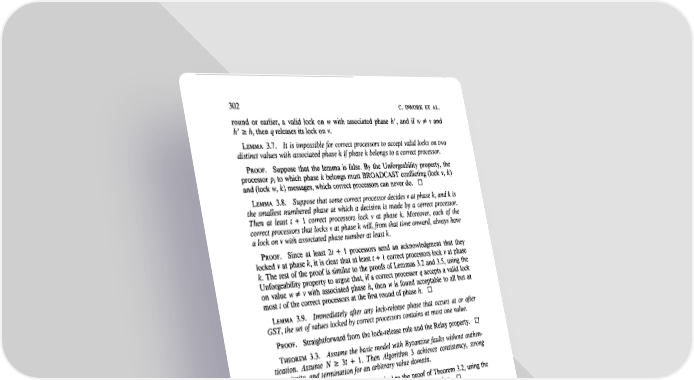 302 C. DWORK ET AL. round or earlier, a valid lock on w with associated phase h ‘, and if w # v and h ’ 2 h, then q releases its lock on v. LEMMA 3.7. It is impossible for correct processors to accept valid locks on two distinct values with associated phase k tfphase k belongs to a correct processor. PROOF. Suppose that the lemma is false. By the Unforgeability property, the processor pi to which phase k belongs must BROADCAST conflicting (lock v, k) and (lock w, k) messages, which correct processors can never do. Cl LEMMA 3.8. Suppose that some correct processor decides v at phase k, and k is the smallest numbered phase at which a decision is made by a correct processor. Then at least t + 1 correct processors lock v at phase k. Moreover, each of the correct processors that locks v at phase k will, from that time onward, always have a lock on v with associated phase number at least k. PROOF. Since at least 2t + 1 processors send an acknowledgment that they locked v at phase k, it is clear that at least t + 1 correct processors lock v at phase k. The rest of the proof is similar to the proofs of Lemmas 3.2 and 3.5, using the Unforgeability property to argue that, if a correct processor q accepts a valid lock on value w # v with associated phase h, then w is found acceptable to all but at most t of the correct processors at the first round of phase h. 0 LEMMA 3.9. Immediately after any lock-release phase that occurs at or after GST, the set of values locked by correct processors contains at most one value. PROOF. Straightforward from the lock-release rule and the Relay property. Cl THEOREM 3.3. Assume the basic model with Byzantine faults without authen- tication. Assume N 2 3t + 1. Then Algorithm 3 achieves consistency, strong unanimity, and termination for an arbitrary value domain. PROOF. The proof is virtually identical to the proof of Theorem 3.2, using the Correctness and Relay properties after GST to argue termination. 0 An upper bound on the number of rounds required is GST + 6(N + 1). Remark 1. Algorithms l-3 have the property that all correct processors make a decision within O(N) rounds after GST. The time to reach agreement after GST can be improved to O(t) rounds by some simple modifications. The bound O(t) is optimal to within a constant factor, since t + 1 rounds are necessary even if communication and processors are both synchronous and failures are fail-stop [7, 91. A modification to all the algorithms is to have a processor repeatedly broadcast the message “Decide v” after it decides v. For Algorithm 1 (fail-stop and omission faults), a processor can decide v when it receives any “Decide v” message. For Algorithms 2 and 3 (Byzantine faults), a processor can decide v when it receives t + 1 “Decide v” messages from different sources. Easy arguments show that the modified algorithms are still correct and that all correct processors make a decision within O(t) rounds after GST; these arguments are left to the reader. 4. Partially Synchronous Communication and Synchronous Processors In this section we assume that processors are completely synchronous (a = 1) and communication is partially synchronous. We show how to use these models to simulate the basic model of Section 3.1 and thus to solve the same consensus problem.