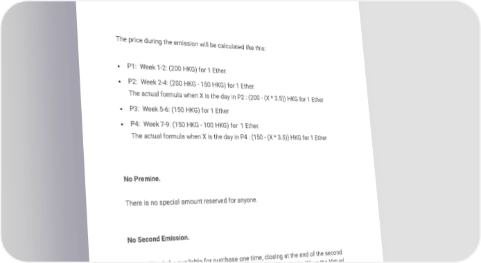 Hacker Gold The price during the emission will be calculated like this: • P1: Week 1-2: (200 HKG) for 1 Ether. • P2: Week 2-4: (200 HKG - 150 HKG) for 1 Ether. The actual formula when X is the day in P2 : (200 - (X * 3.5)) HKG for 1 Ether • P3: Week 5-6: (150 HKG) for 1 Ether • P4: Week 7-9: (150 HKG - 100 HKG) for 1 Ether. The actual formula when X is the day in P4 : (150 - (X * 3.5)) HKG for 1 Ether No Premine. There is no special amount reserved for anyone. No Second Emission. HKG will only be available for purchase one time, closing at the end of the second hackathon (December 2016) event. There will be no second sale. When the Virtual Accelerator opens to new entrants through future hackathons the only way to purchase HKG will be on the open market.