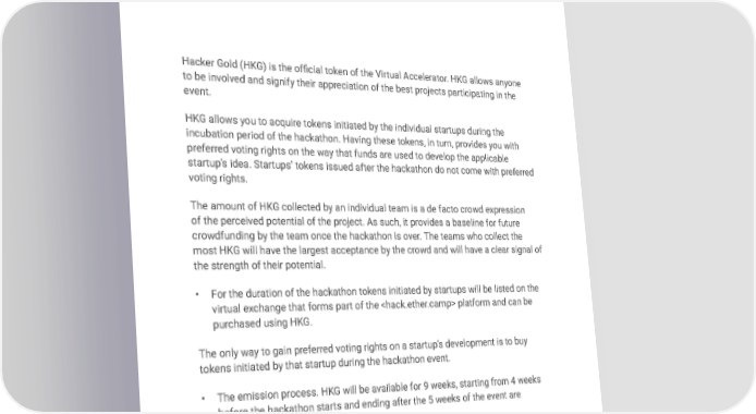 Hacker Gold "Money never starts an idea; it is the idea that starts the money." - William J. Cameron Hacker Gold (HKG) is the official token of the Virtual Accelerator. HKG allows anyone to be involved and signify their appreciation of the best projects participating in the event. HKG allows you to acquire tokens initiated by the individual startups during the incubation period of the hackathon. Having these tokens, in turn, provides you with preferred voting rights on the way that funds are used to develop the applicable startup’s idea. Startups’ tokens issued after the hackathon do not come with preferred voting rights. The amount of HKG collected by an individual team is a de facto crowd expression of the perceived potential of the project. As such, it provides a baseline for future crowdfunding by the team once the hackathon is over. The teams who collect the most HKG will have the largest acceptance by the crowd and will have a clear signal of the strength of their potential. • For the duration of the hackathon tokens initiated by startups will be listed on the virtual exchange that forms part of the platform and can be purchased using HKG. The only way to gain preferred voting rights on a startup’s development is to buy tokens initiated by that startup during the hackathon event. • The emission process. HKG will be available for 9 weeks, starting from 4 weeks before the hackathon starts and ending after the 5 weeks of the event are complete.