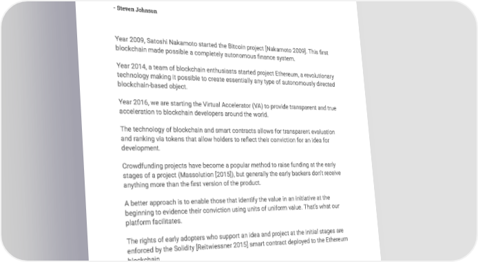 Introduction “If you look at history, innovation doesn't come just from giving people incentives; it comes from creating environments where their ideas can connect.” - Steven Johnson Year 2009, Satoshi Nakamoto started the Bitcoin project [Nakamoto 2009]. This first blockchain made possible a completely autonomous finance system. Year 2014, a team of blockchain enthusiasts started project Ethereum, a revolutionary technology making it possible to create essentially any type of autonomously directed blockchain-based object. Year 2016, we are starting the Virtual Accelerator (VA) to provide transparent and true acceleration to blockchain developers around the world. The technology of blockchain and smart contracts allows for transparent evaluation and ranking via tokens that allow holders to reflect their conviction for an idea for development. Crowdfunding projects have become a popular method to raise funding at the early stages of a project (Massolution [2015]), but generally the early backers don’t receive anything more than the first version of the product. A better approach is to enable those that identify the value in an initiative at the beginning to evidence their conviction using units of uniform value. That’s what our platform facilitates. The rights of early adopters who support an idea and project at the initial stages are enforced by the Solidity [Reitwiessner 2015] smart contract deployed to the Ethereum blockchain.