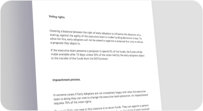 BlockChain Presence Voting rights Creating a balance between the right of early adopters to influence the direction of a startup, against the agility of the executive team to make funding decisions is key. To allow for this, early adopters will not be asked to approve a proposal but only to refuse a proposal they object to. If the executive team presents a proposal to spend X% of the funds, the funds will be made available after 10 days unless 55% of the votes held by the early adopters object to the transfer of the funds from the DSTContract. Impeachment process. In extreme cases if Early Adopters are not completely happy with what the executive team is doing they can vote to change the executive team personnel. An impeachment requires 70% of the voter rights. The most likely use case in this instance is to return funds. They can appoint a person who will be responsible for returning the funds according to the share of each involved person.