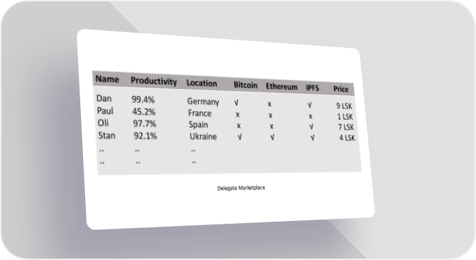Name Productivity Location Bitcoin Ethereum IPFS Price Dan 99.4% Germany √ x √ 9 LSK Paul 45.2% France x x x 1 LSK Oli 97.7% Spain x x √ 7LSK Stan 92.1% Ukraine √ √ √ 4 LSK .. .. .. .. .. .. Delegate Marketplace Lisk Page 51 Page 53
