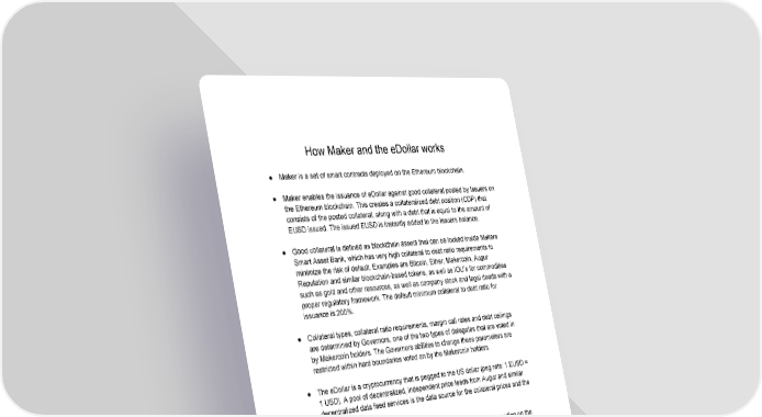 How Maker and the eDollar works ● Maker is a set of smart contracts deployed on the Ethereum blockchain. ● Maker enables the issuance of eDollar against good collateral posted by Issuers on the Ethereum blockchain. This creates a collateralized debt position (CDP) that consists of the posted collateral, along with a debt that is equal to the amount of EUSD issued. The issued EUSD is instantly added to the Issuers balance. ● Good collateral is defined as blockchain assets that can be locked inside Makers Smart Asset Bank, which has very high collateral to debt ratio requirements to minimize the risk of default. Examples are Bitcoin, Ether, Makercoin, Augur Reputation and similar blockchainbased tokens, as well as IOU’s for commodities such as gold and other resources, as well as company stock and legal deeds with a proper regulatory framework. The default minimum collateral to debt ratio for issuance is 200%. ● Collateral types, collateral ratio requirements, margin call rates and debt ceilings are determined by Governors, one of the two types of delegates that are voted in by Makercoin holders. The Governors abilities to change these parameters are restricted within hard boundaries voted on by the Makercoin holders. ● The eDollar is a cryptocurrency that is pegged to the US dollar (peg rate: 1 EUSD = 1 USD). A pool of decentralized, independent price feeds from Augur and similar decentralized data feed services is the data source for the collateral prices and the status of the peg. ● Issuers must pay an interest rate on their debt, that varies daily depending on the status of the peg. ● The interest rate is manipulated to enforce the peg in the long run. If the independent price feeds determine that EUSD is valued above the peg, the interest rate decreases by 1 percent. If the independent price feeds determine that EUSD is valued below the peg, the interest rate increases by 1 percent. If the peg is holding, the governors can choose to modify the interest rate with up to 0.5 percent in either direction. This adjustment happens every 24 hours. ● The peg is defined as holding if the independent price feeds report a price between 99 and 101 US cents per EUSD. ● Half of the income from the interest payments are put in the Maker Vault, Makers eDollar account.
