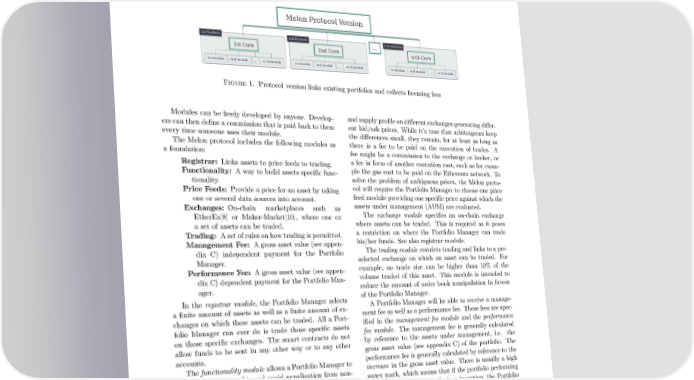 MELON PROTOCOL: A BLOCKCHAIN PROTOCOL FOR DIGITAL ASSET MANAGEMENT DRAFT 2 on how the core interacts with its modules constitute the of the portfolio, these subjective parts can be changed. Melon protocol. For example different Portfolio Managers might want to 3.2. Modules. The modules provide auxiliary function- charge different management fees and apply their own ality to the core part. For example, providing off-chain methods on how to calculate these fees. The modular data, storing of portfolio relevant data or the executing of concept allows the managers to chose the management calculations for the portfolio. fee module of their liking. Thus they can select the fees The modules are the parts of the portfolio which have and calculation methodology by simply linking the corre- subjective functionality. Through the modular concept sponding module to the core. Figure 1. Protocol version links existing portfolios and collects licensing fees Modules can be freely developed by anyone. Develop- andsupplyprofileondifferentexchangesgeneratingdiffer- ers can then define a commission that is paid back to them ent bid/ask prices. While it’s true that arbitrageurs keep every time someone uses their module. the differences small, they remain, for at least as long as The Melon protocol includes the following modules as there is a fee to be paid on the execution of trades. A a foundation: fee might be a commission to the exchange or broker, or Registrar: Links assets to price feeds to trading. a fee in form of another execution cost, such as for exam- Functionality: A way to build assets specific func- ple the gas cost to be paid on the Ethereum network. To tionality. solve the problem of ambiguous prices, the Melon proto- Price Feeds: Provide a price for an asset by taking col will require the Portfolio Manager to choose one price one or several data sources into account. feed module providing one specific price against which the Exchanges: On-chain marketplaces such as assets under management (AUM) are evaluated. EtherEx[8] or Maker-Market[10], where one or The exchange module specifies an on-chain exchange a set of assets can be traded. where assets can be traded. This is required as it poses Trading: Asetofrulesonhowtradingispermitted. a restriction on where the Portfolio Manager can trade Management Fee: Agrossassetvalue(see appen- his/her funds. See also registrar module. dix C) independent payment for the Portfolio Thetrading module restricts trading and links to a pre- Manager. selected exchange on which an asset can be traded. For Performance Fee: A gross asset value (see appen- example, no trade size can be higher than 10% of the dix C) dependent payment for the Portfolio Man- volume traded of this asset. This module is intended to ager. reduce the amount of order book manipulation in favour In the registrar module, the Portfolio Manager selects of the Portfolio Manager. a finite amount of assets as well as a finite amount of ex- APortfolio Manager will be able to receive a manage- changes on which these assets can be traded. All a Port- mentfee as well as a performance fee. These fees are spec- folio Manager can ever do is trade those specific assets ified in the management fee module and the performance on those specific exchanges. The smart contracts do not fee module. The management fee is generally calculated allow funds to be sent in any other way or to any other by reference to the assets under management, i.e. the accounts. gross asset value (see appendix C) of the portfolio. The Thefunctionality module allows a Portfolio Manager to performance fee is generally calculated by reference to the retain actions or rights and avoid penalization from non- increase in the gross asset value. There is usually a high action (eg. Augur’s REP tokens). These interactions be- water mark, which means that if the portfolio performing tween token custodian and corresponding smart-contracts below a defined benchmark since inception, the Portfolio need to be programmed in as it is no longer an individual’s Manager does not get paid a performance fee. Alternative or non-contract account which controls these funds. forms of performance fees are conceivable. For example, Theprice feeds module is needed as asset prices, in gen- the interval by which the performance fee gets paid out eral, tend to be different on different exchanges. This is can be selected by the Portfolio Manager. because of the inherent way prices are set - a price is set Before the deployment of a portfolio, a Portfolio Man- by demand and supply which constitutes of market par- ager decides which modules he/she would like to use. ticipants wanting to buy or sell. In this context, the word Once the portfolio is deployed this then can be seen as market participants also refers to trading algorithms, etc. the offering of a legal contract. The contract terms are un- In general, market participants reflect a different demand ambiguously visible and securely held by the Blockchain.