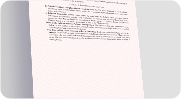 POLKADOT: VISION FOR A HETEROGENEOUS MULTI-CHAIN FRAMEWORK DRAFT 1 21 fishermen. Development is predicated on an initial feasibility analysis giving a favourable result. Some additional functionality may need to be added to (or unlocked from) the Bitcoin protocol to support this functionality. Abstract/low-level decentralised applications: Trust-freetokenexchange,asset-trackinginfrastructure, crowd- sale infrastructure. Contract language: Certainly not an integral part of the project, but a nice stretch-goal nonetheless. Would include a safe contract language together with tutorials, guidelines and educational tools. It may include means of making formal proofs as per the original Solidity language vision or could be based around some other programmingparadigmwhichhelpsminimisecriticalprocesserrorssuchasfunctionalprogrammingorcondition- orientated programming. IDE: Based on the contract language, this would facilitate editing, collaboration, publication and debugging of contracts on the parachains. A far stretch goal. Appendix B. Frequently Asked Questions Is Polkadot designed to replace (insert blockchain here): No. The goal of Polkadot is to provide a frame- work under which new blockchains may be created and to which existing blockchains can, if their communities desire, be transitioned. Is Polkadot designed to replace (insert crypto-currency here): No. Polkadot tokens are neither intended nor designed to be used as a currency. They would make a bad currency: most will remain illiquid in the staking system and those that are liquid will face substantial fees for transfer of ownership. Rather, the purpose of Polkadot tokens is to be a direct representation of stake in the Polkadot network. What is the inflation rate for Polkadot staking tokens: The Polkadot staking token base expansion is un- limited. It rises and lowers according to market effects in order to target a particular proportion of tokens held under long-term bond in the validation process. Whydoes staking token ownership reflect stakeholding: Thisisamechanismrealisedbythefactthatthey underpin the network’s security. As such their value is tied to the overall economic value that Polkadot provides. Any actors who gain overall value from Polkadot operating correctly are incentivised to ensure it continues to do so. The best means of doing so is to take part in the validation process. This generally implies ownership of staking tokens.