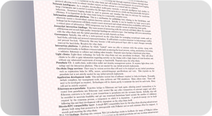POLKADOT: VISION FOR A HETEROGENEOUS MULTI-CHAIN FRAMEWORK DRAFT 1 20 with the network protocol into a means of directed transaction propagation, ensuring independent parachain collators are not overly exposed to transactions that are not of interest. Relay chain: This is the final stage of the relay-chain, allowing the dynamic addition, removal and emergency pausing of parachains, the reporting of bad behaviour and includes implementation of the “fisherman” function- ality. Independent collators: This is the delivery of an alternative chain-specific collator functionality. It includes proof creation (for collators), parachain misbehaviour detection (for fishermen) and the validation function (for validators). It also includes any additional networking required to allow the two to discover and communicate. Network dynamics modelling and research: Theoverall dynamics of this protocol should be researched thor- oughly. This can happen both through offline network modelling and through empirical evidence through simu- lated nodes. The latter is dependent on the relay-chain and will include the development of a structured logging protocol allowing nodes to submit detailed reports on their actions to a central hub for collation. Network intelligence: As a complex decentralised multi-party network, a network intelligence hub similar to http://ethstats.netisneededtomonitorthelife-signs of the network as a whole and flag potentially disruptive behaviour. Structured logging should be used to generate and visualise this data in real-time for maximum efficiency. It is dependent on the relay-chain being in a reasonably complete state. Information publication platform: This is a mechanism for publishing data relating to the blockchain, and effectively means a decentralised content-discovery network. Initially it can be handled by basic peer-to-peer lookups but for deployment will likely require a more structured and robust solution since availability will become a critical piece of information. IPFS integration may be the most sensible means of achieving these goals. Javascript interaction bindings: The main means of interacting with the network will likely follow the example of Ethereumandassuchhigh-qualityJavascriptbindingsarecritical to have. Our bindings will cover interactions with the relay-chain and the initial parachain and as such depends on them. Governance: Initially, this will be a meta-protocol on the relay-chain for managing exceptional events such as hard-forks, soft-forks and protocol reparameterisation. It will include a modern structure to help manage conflict and prevent live-lock. Ultimately, this may become a full meta-protocol layer able to enact changes normally reserved for hard-forks. Requires the relay chain. Interaction platform: A platform by which “typical” users are able to interact with the system, along with minimalfunctionalitytofacilitate commontaskssuchasenteringthebondprocess, voting, nomination, becoming a validator, fisherman or collator and staking token transfer. Depends upon having a functional relay-chain. Light clients: Light-client technology for both the relay-chain and any parachains developed. This will allow clients to be able to gain information regarding activity on the chains with a high degree of trust-freedom and without any substantial requirement of storage or bandwidth. Depends upon the relay-chain. Parachain UI: A multi-chain, multi-token wallet and identity management system. It requires light-client tech- nology and the interaction platform. This is not needed for any initial network deployment. On-chain Dapp services: There may be various services that will need to be deployed on any initial parachains such as registration hubs for APIs, names, natural-language specifications and code. This depends on the parachain but is not strictly needed for any initial network deployment. Application development tools: This includes various bits of software required to help developers. Examples include compilers, key management tools, data archivers and VM simulators. Many others exist. These will need to be developed as required. Technologies will be chosen partly to minimise the need for such tools. Many will not be strictly required. Ethereum-as-a-parachain: Trust-free bridge to Ethereum and back again, allowing posted transactions to be routed from parachains into Ethereum (and treated like any other transaction of external origin) and allow Ethereum contracts to be able to post transactions to parachains and the accounts therein. Initially, this will be modelled to ascertain feasibility and get any structural limitations based around the number of validators required by the consensus process, a component on which it is dependent. A proof-of-concept can be built following this and final development will be dependent on the relay-chain itself. Bitcoin-RPC compatibility layer: AsimpleRPCcompatibilitylayer for the relay-chain allowing infrastructure already built using that protocol to be interoperable with Polkadot and as such minimise effort for support. A stretch goal requiring the relay-chain. Web 2.0 bindings: Bindings into common Web 2.0 technology stacks to facilitate the usage of Polkadot infras- tructure with legacy systems. A stretch goal dependent on the initial parachains and any on-chain infrastructure to be exposed. zk-SNARK parachain example: Aparachainutilisingthepropertiesofzk-SNARKsinordertoensureidentities of transactors on it are kept private. A stretch goal dependent on the relay-chain. Encrypted parachain example: A parachain that keeps each item of state encrypted and signed. These ensure the enforcement of access controls over inspection and modification of the data therein allowing commercial regulated operations to conform as necessary. Would include proof-of-authority mechanisms to allow Polkadot validators to guarantee some degree of correctness of state transitions without gaining exposure to the underlying informat