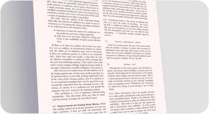 POLKADOT: VISION FOR A HETEROGENEOUS MULTI-CHAIN FRAMEWORK DRAFT 1 12 available? This is only relevant for validators as- task of guaranteeing availability with the validators pro- signed to the parachain on which they are voting. viding a portion of their interest/income in payment. They may vote either 1 (valid), -1 (invalid) or 0 However, while this might buy some intermediate scal- (not yet known). Once they vote non-zero, they ability, it still doesn’t help the underlying problem; since are committed to voting this way for the rest of adding more chains will in general require additional val- the process. Later votes that do not respect this idators, the ongoing network resource consumption (par- are grounds for punishment. ticularly in terms of bandwidth) grows with the square of All validators must submit votes; votes may be resub- the chains, an untenable property in the long-term. mitted, qualified by the rules above. The progression of Ultimately, we are likely to keep bashing our heads consensusmaybemodelledasmultiplestandardBFTcon- against the fundamental limitation which states that for sensus algorithms over each parachain happening in par- a consensus network to be considered available safe, the allel. Since these are potentially thwarted by a relatively ongoing bandwidth requirements are of the order of total small minority of malicious actors being concentrated in validators times total input information. This is due to a single parachain group, the overall consensus exists to the inability of an untrusted network to properly distrib- establish a backstop, limiting the worst-case scenario from ute the task of data storage across many nodes, which sits deadlocktomerelyoneormorevoidparachainblocks(and apart from the eminently distributable task of processing. a round of punishment for those responsible). 6.5.1. Introducing Latency. One means of softening this The basic rules for validity of the individual blocks rule is to relax the notion of immediacy. By requir- (that allow the total set of validators as a whole to come to ing 33%+1 validators voting for availability only eventu- consensus on it becoming the unique parachain candidate ally, and not immediately, we can better utilise exponen- to be referenced from the canonical relay): tial data propagation and help even out peaks in data- • must have at least two thirds of its validators vot- interchange. A reasonable equality (though unproven) ing positively and none voting negatively; may be: • must have over one third validators voting posi- tively to the availability of egress queue informa- (1) latency = participants×chains tion. Under the current model, the size of the system scales If there is at least one positive and at least one nega- with the number of chains to ensure that processing is tive vote on validity, an exceptional condition is created distributed; since each chain will require at least one val- and the whole set of validators must vote to determine idator and we fix the availability attestation to a constant if there are malicious parties or if there is an accidental proportion of validators, then participants similarly grows fork. Aside from valid and invalid, a third kind of votes with the number of chains. We end up with: are allowed, equivalent to voting for both, meaning that the node has conflicting opinions. This could be due to the 2 node’s owner running multiple implementations which do (2) latency = size not agree, indicating a possible ambiguity in the protocol. Meaning that as the system grows, the bandwidth re- After all votes are counted from the full validator set, if quired and latency until availability is known across the the losing opinion has at least some small proportion (to network, which might also be characterised as the number be parameterised; at most half, perhaps significantly less) of blocks before finality, increases with its square. This is of the votes of the winning opinion, then it is assumed to a substantial growth factor and may turn out to be a no- be an accidental parachain fork and the parachain is au- table road blocker and force us into “non-flat” paradigms tomatically suspended from the consensus process. Oth- such as composing several “Polkadotes” into a hierarchy erwise, we assume it is a malicious act and punish the for multi-level routing of posts through a tree of relay- minority who were voting for the dissenting opinion. chains. The conclusion is a set of signatures demonstrating canonicality. The relay-chain block may then be sealed 6.5.2. Public Participation. One more possible direction and the process of sealing the next block begun. is to enlist public participation in the process through a micro-complaints system. Similar to the fishermen, there couldbeexternalpartiestopolicethevalidatorswhoclaim 6.5. Improvements for Sealing Relay Blocks. While availability. Their task is to find one who appears un- this sealing method gives strong guarantees over the sys- able to demonstrate such availability. In doing so they tem’s operation, it does not scale out particularly well can lodge a micro-complaint to other validators. PoW or since every parachain’s key information must have its a staked bond may be used to mitigate the sybil attack availability guaranteed by over one-third of all validators. which would render the system largely useless. This means that every validator’s responsibility footprint grows as more chains are added. 6.5.3. Availability Guarantors. A final route would be to Whiledataavailability within open consensus networks nominateasecondsetofbondedvalidatorsas“availability is essentially an unsolved problem, there are ways of miti- guarantors”. These would be bonded just as with the nor- gating the overhead placed on validator nodes. One simple mal validators, and may even be taken from the same set solution is to realise that while validators must shoulder (though if so, they would be chosen over a long-t