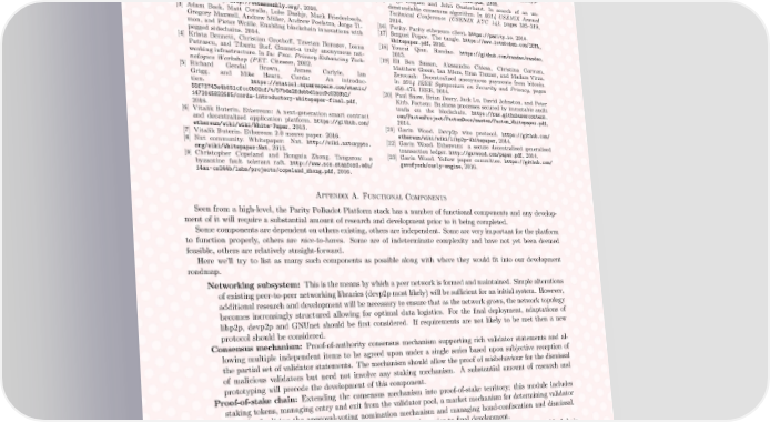 POLKADOT: VISION FOR A HETEROGENEOUS MULTI-CHAIN FRAMEWORK DRAFT 1 19 have contributed ideas or the beginnings thereof, Marek [10] Ethan Buchman Jae Kwon. Cosmos: A network of Kotewicz and Aeron Buchanan deserve especial mention. distributed ledgers. https://github.com/cosmos/cosmos/blob/ And thanks to everyone else for their help along the way. master/WHITEPAPER.md, 2016. [11] Jae Kwon. Tendermint: Consensus without mining. http: All errors are my own. //tendermint.com/docs/tendermint.pdf, 2014. Portions of this work, including initial research into [12] Daniel Larimer. Bitshares. http://docs.bitshares.org/ bitshares/history.html, 2013. consensus algorithms, was funded in part by the British [13] Andrew Miller, Yu Xia, Kyle Croman, Elaine Shi, and Dawn Government under the Innovate UK programme. Song. The honey badger of bft protocols. Technical report, Cryptology ePrint Archive 2016/199, 2016. References [14] Satoshi Nakamoto. Bitcoin: A peer-to-peer electronic cash sys- tem. https://bitcoin.org/bitcoin.pdf, 2008. [1] The specs for libp2p and associated submodules. https:// [15] Diego Ongaro and John Ousterhout. In search of an un- github.com/libp2p/specs. derstandable consensus algorithm. In 2014 USENIX Annual [2] Webassembly. http://webassembly.org/, 2016. Technical Conference (USENIX ATC 14), pages 305–319, [3] Adam Back, Matt Corallo, Luke Dashjr, Mark Friedenbach, 2014. Gregory Maxwell, Andrew Miller, Andrew Poelstra, Jorge Ti- [16] Parity. Parity ethereum client. https://parity.io, 2016. mon, and Pieter Wuille. Enabling blockchain innovations with [17] Serguei Popov. The tangle. https://www.iotatoken.com/IOTA_ pegged sidechains. 2014. Whitepaper.pdf, 2016. [4] Krista Bennett, Christian Grothoff, Tzvetan Horozov, Ioana [18] Youcai Qian. Randao. https://github.com/randao/randao, Patrascu, and Tiberiu Stef. Gnunet-a truly anonymous net- 2015. workinginfrastructure. In In: Proc. Privacy Enhancing Tech- [19] Eli Ben Sasson, Alessandro Chiesa, Christina Garman, nologies Workshop (PET. Citeseer, 2002. Matthew Green, Ian Miers, Eran Tromer, and Madars Virza. [5] Richard Gendal Brown, James Carlyle, Ian Zerocash: Decentralized anonymous payments from bitcoin. Grigg, and Mike Hearn. Corda: An introduc- In 2014 IEEE Symposium on Security and Privacy, pages tion. https://static1.squarespace.com/static/ 459–474. IEEE, 2014. 55f73743e4b051cfcc0b02cf/t/57bda2fdebbd1acc9c0309b2/ [20] Paul Snow, Brian Deery, Jack Lu, David Johnston, and Peter 1472045822585/corda-introductory-whitepaper-final.pdf, Kirb. Factom: Business processes secured by immutable audit 2016. trails on the blockchain. https://raw.githubusercontent. [6] Vitalik Buterin. Ethereum: A next-generation smart contract com/FactomProject/FactomDocs/master/Factom_Whitepaper.pdf, and decentralized application platform. https://github.com/ 2014. ethereum/wiki/wiki/White-Paper, 2013. [21] Gavin Wood. Devp2p wire protocol. https://github.com/ [7] Vitalik Buterin. Ethereum 2.0 mauve paper. 2016. ethereum/wiki/wiki/libp2p-Whitepaper, 2014. [8] Nxt community. Whitepaper: Nxt. http://wiki.nxtcrypto. [22] Gavin Wood. Ethereum: a secure decentralised generalised org/wiki/Whitepaper:Nxt, 2013. transaction ledger. http://gavwood.com/paper.pdf, 2014. [9] Christopher Copeland and Hongxia Zhong. Tangaroa: a [23] Gavin Wood. Yellow paper committee. https://github.com/ byzantine fault tolerant raft. http://www.scs.stanford.edu/ gavofyork/curly-engine, 2016. 14au-cs244b/labs/projects/copeland_zhong.pdf, 2016. Appendix A. Functional Components Seen from a high-level, the Parity Polkadot Platform stack has a number of functional components and any develop- ment of it will require a substantial amount of research and development prior to it being completed. Somecomponentsaredependentonothersexisting, others are independent. Some are very important for the platform to function properly, others are nice-to-haves. Some are of indeterminate complexity and have not yet been deemed feasible, others are relatively straight-forward. Here we’ll try to list as many such components as possible along with where they would fit into our development roadmap. Networking subsystem: Thisisthemeansbywhichapeernetworkisformedandmaintained. Simplealterations of existing peer-to-peer networking libraries (devp2p most likely) will be sufficient for an initial system. However, additional research and development will be necessary to ensure that as the network grows, the network topology becomes increasingly structured allowing for optimal data logistics. For the final deployment, adaptations of libp2p, devp2p and GNUnet should be first considered. If requirements are not likely to be met then a new protocol should be considered. Consensus mechanism: Proof-of-authority consensus mechanism supporting rich validator statements and al- lowing multiple independent items to be agreed upon under a single series based upon subjective reception of the partial set of validator statements. The mechanism should allow the proof of misbehaviour for the dismissal of malicious validators but need not involve any staking mechanism. A substantial amount of research and prototyping will precede the development of this component. Proof-of-stake chain: Extending the consensus mechanism into proof-of-stake territory; this module includes staking tokens, managing entry and exit from the validator pool, a market mechanism for determining validator rewards, finalising the approval-voting nomination mechanism and managing bond-confiscation and dismissal. It includes a substantial amount of research and prototyping prior to final development. Parachain implementation: Afirstparachainimplementation,likelytobebasedheavilyonanexistingblockchain protocol such as Bitcoin or (more likely, since it provides for rich transactions) Ethereum. This will include an integration with the proof-of-stake chain, allowing the parachain to gain consensus without its own internal consensus mechanism. Transaction processin