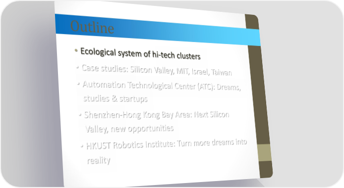 Outline • Ecological system of hi-tech clusters • Case studies: Silicon Valley, MIT, Israel, Taiwan • Automation Technological Center (ATC): Dreams, studies & startups • Shenzhen-Hong Kong Bay Area: Next Silicon Valley, new opportunities • HKUST Robotics Institute: Turn more dreams into reality