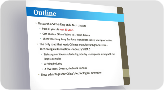 Outline • Research and thinking on hi-tech clusters • Past 30 years & next 30 years • Cast studies: Silicon Valley, MIT, Israel, Taiwan • Shenzhen-Hong Kong Bay Area: Next Silicon Valley, new opportunities • The only road that leads Chinese manufacturing to success – Technological Innovation + Industry 3.0/4.0 • Status quo of the manufacturing industry – a corporate survey with the largest samples • A rising industry • A few cases: Dreams, studies & startups • New advantages for China’s technological innovation