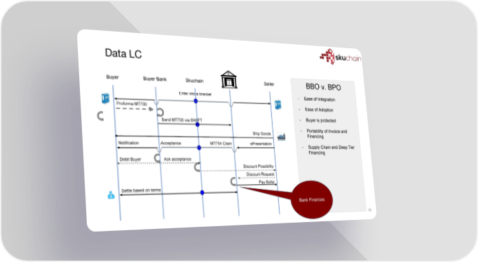 Data LC Buyer Buyer Bank Skuchain Seller BBO v. BPO Enter into a bracket - Ease of Integration Proforma MT700 - Ease of Adoption - Buyer is protected Send MT700 via SWIFT - Portability of Invoice and Ship Goods Financing Notification Acceptance MT754 Claim ePresentation - Supply Chain and Deep Tier Financing Debit Buyer Ack acceptance Discount Possibility Discount Request Pay Seller Settle based on terms Bank Finances 18