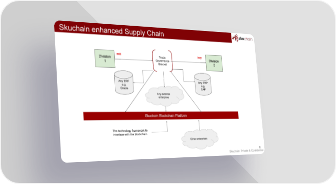 Skuchain enhanced Supply Chain sell buy Trade Division Division Governance 1 2 Bracket Any ERP Any ERP e.g. e.g. Oracle SAP Any external enterprise Skuchain Blockchain Platform The technology framework to interface with the blockchain Other enterprises 8 Skuchain: Private & Confidential