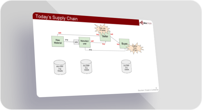 Today’s Supply Chain High cost of capital sell sell buy Seller ship sell Raw Manufact vmi Buyer buy buy Material urer Visibility Track &Trace ship Any ERP Any ERP Any ERP e.g. e.g. e.g. Oracle Oracle Oracle 5 Skuchain: Private & Confidential