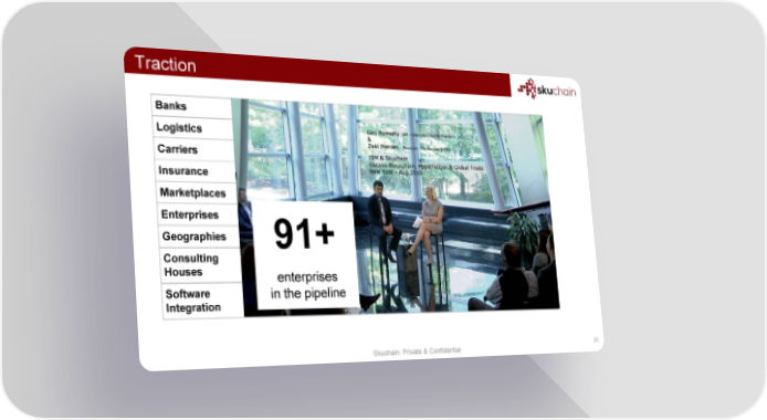 Traction Banks Conversations: 36 Pilots & POC’s: 8 Upcoming announcements: 2 Logistics Kaleido, Cainiao Carriers Maersk, CMA-CGM, INTTRA Insurance Euler Hermes / Allianz, CI Brokers, Marine Underwriters, Pingan Marketplaces Alibaba Enterprises Contract Manufacturers, Solar cell mfg., Geographies US, China, Australia, Korea, Europe, Japan 91+ Consulting 6 of the Top 10 Houses enterprises Software Trading systems, Bank internal systems in the pipeline Integration 25 Skuchain: Private & Confidential