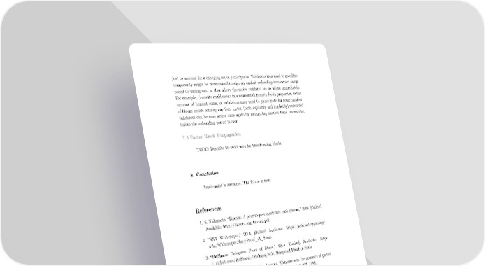 just to account for a changing set of participants. Validators that need to go offline temporarily might be incentivized to sign an explicit unbonding transaction as op- posed to timing out, as that allows the active validator set to adjust immediately. For example, timeouts could result in a some small penalty fee in proportion to the amount of bonded coins, or validators may need to participate for some number of blocks before earning any fees. Later, (both explicitly and implicitly) unbonded validators can become active once again by submitting another bond transaction before the unbonding period is over. 7.3 Faster Block Propagation TODO: Describe lib-swift used for broadcasting blocks 8. Conclusion Tendermint is awesome. The future is now. References 1. S. Nakamoto, “Bitcoin: A peer-to-peer electronic cash system,” 2008. [Online]. Available: http://bitcoin.org/bitcoin.pdf 2. “NXT Whitepaper,” 2014. [Online]. Available: https://wiki.nxtcrypto.org/ wiki/Whitepaper:Nxt#Proof_of_Stake 3. “BitShares Delegated Proof of Stake,” 2014. [Online]. Available: https: //github.com/BitShares/bitshares/wiki/Delegated-Proof-of-Stake 4. C. Dwork, N. Lynch, and L. Stockmeyer, “Consensus in the presence of partial synchrony,” Journal of the ACM, vol. 35, no. 2, pp. 288–323, 1988. 5. J. A. Kroll, I. C. Davey, and E. W. Felten, “The Economics of Bitcoin Mining or, Bitcoin in the Presence of Adversaries,” Workshop on the Economics of Information Security, 2013. 6. I. Eyal and E. G. Sirer, “Majority is not Enough: Bitcoin Mining is Vulnerable,” 2014. 7. R. Merkle, “Protocols for public key cryptosystems,” Proc. 1980 Symposium on Security and Privacy, pp. 122–133, April 1980. 8. Wikipedia, “Bitcoin Days Destroyed,” 2011. [Online]. Available: https: //en.bitcoin.it/wiki/Bitcoin_Days_Destroyed 10