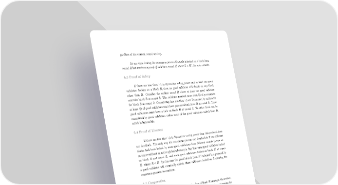 gardless of the current round or step. At any time during the consensus process if a node is locked on a block from round R but receives a proof-of-lock for a round R′ where R < R′, the node unlocks. 6.3 Proof of Safety 1 If there are less than /3 in Byzantine voting power and at least one good validator decides on a block B, then no good validator will decide on any block other than B. Consider the earliest round R where at least one good validator 2 commits block B at round R. This validator received more than /3 of precommits 1 for block B at round R. Considering that less than /3 are Byzantine, by arithmetic 1 at least /3 of good validators must have precommitted block B at round R. These good validators must have a lock on block B at round R. No other block can be committed by good validators unless some of the good validators unlock from B, which is impossible. 6.4 Proof of Liveness 1 If there are less than /3 in Byzantine voting power then this protocol does not deadlock. The only way the consensus process can deadlock is if two different blocks had been locked by some good validators from different rounds (a rare oc- currence without an active global adversary). Say that some good validators locked on block B and round R, and some good validators locked on block B′ at round R′, where R < R′. In this case the proof-of-lock from R′ included in a proposal by a good validator will eventually unlock those validators locked on R allowing the consensus process to continue. 6.5 Cooperation Since validators divide the transaction fees of block H amongst themselves, a greedy validator might be tempted to exclude some signatures when proposing the next block H+1. This is an inferior strategy when considering that other validators are game optimal participants. Given that the total amount of fees to be divided in a block is f , and that the sum of the voting powers v of all validators that 1 i have signed and successfully broadcasted their signatures is 1, consider proposer P with voting power v < 1 who is considering whether to include validator Alice’s p signature with voting power v < 1. At stake is Alice’s fair share of the fees which a is f1 · va. Of this, P’s incremental benefit of excluding Alice’s signature is: f ·v ·v /(1−v ) 1 a p a Then, Alice could react tit-for-tat by excluding P’s signature when it be- comes Alice’s turn to propose the next block, where the sum of the fees in that 8