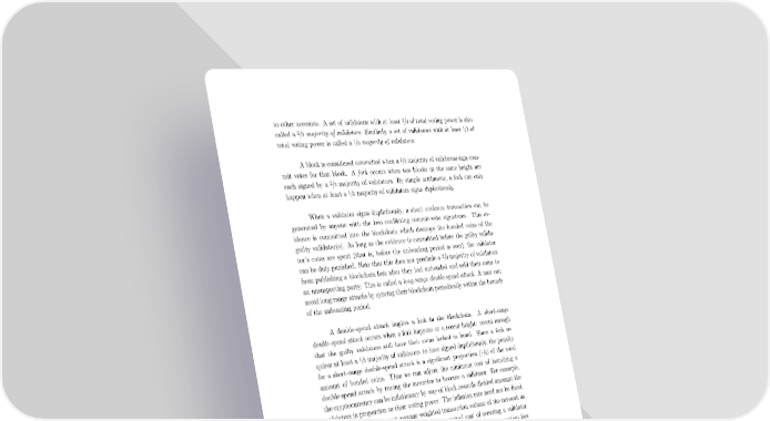 2 to other accounts. A set of validators with at least /3 of total voting power is also 2 1 called a /3 majority of validators. Similarly, a set of validators with at least /3 of 1 total voting power is called a /3 majority of validators. 2 Ablock is considered committed when a /3 majority of validators sign com- mit votes for that block. A fork occurs when two blocks at the same height are 2 each signed by a /3 majority of validators. By simple arithmetic, a fork can only 1 happen when at least a /3 majority of validators signs duplicitously. When a validator signs duplicitously, a short evidence transaction can be generated by anyone with the two conflicting commit-vote signatures. This ev- idence is committed into the blockchain which destroys the bonded coins of the guilty validator(s). As long as the evidence is committed before the guilty valida- tor’s coins are spent (that is, before the unbonding period is over), the validator 2 can be duly punished. Note that this does not preclude a /3 majority of validators from publishing a blockchain fork after they had unbonded and sold their coins to an unsuspecting party. This is called a long-range double-spend attack. A user can avoid long-range attacks by syncing their blockchain periodically within the bounds of the unbonding period. A double-spend attack implies a fork in the blockchain. A short-range double-spend attack occurs when a fork happens at a recent height: recent enough that the guilty validators still have their coins locked in bond. Since a fork re- 1 quires at least a /3 majority of validators to have signed duplicitously, the penalty 1 for a short-range double-spend attack is a significant proportion ( /3) of the total amount of bonded coins. Thus we can adjust the minimum cost of launching a double-spend attack by tuning the incentive to become a validator. For example, the cryptocurrency can be inflationary by way of block rewards divided amongst the validators in proportion to their voting power. The inflation rate need not be fixed, but can depend on the past average weighted transaction volume of the network as measured by coin-days-destroyed [8]. If the marginal cost of securing a validator node is negligible, the reward scheme need not be inflationary; the transaction fees paid by users may be sufficient. 6. Consensus 6.1 On Byzantine Consensus Fischer et al have shown in a seminal paper [9] that in an asynchronous system (where no assumptions are made about time) of deterministic processes, no protocol can guarantee consensus even with one faulty process. This is called the FLP impossibility result. Much research has gone into understanding ways to circumvent the FLP impossibility result by slightly modifying the problem do- 4
