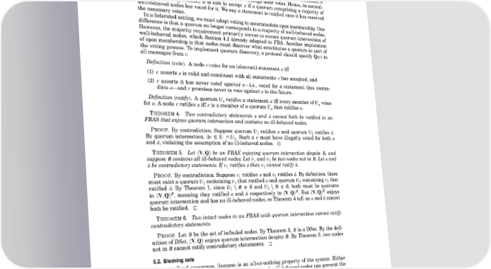 ` 12 D. Mazieres 5.1. Voting with open membership Acorrect node in a Byzantine agreement system acts on a statement a only when it knows that other correct nodes will never agree to statements contradicting a. Most protocols employ voting for this purpose. Well-behaved nodes vote for a statement a only if it is valid. Well-behaved nodes also never change their votes. Hence, in central- ized Byzantine agreement, it is safe to accept a if a quorum comprising a majority of well-behaved nodes has voted for it. We say a statement is ratified once it has received the necessary votes. Inafederatedsetting,wemustadaptvotingtoaccommodateopenmembership.One difference is that a quorum no longer corresponds to a majority of well-behaved nodes. However, the majority requirement primarily serves to ensure quorum intersection of well-behaved nodes, which Section 4.1 already adapted to FBA. Another implication of open membership is that nodes must discover what constitutes a quorum as part of the voting process. To implement quorum discovery, a protocol should specify Q(v) in all messages from v. Definition (vote). A node v votes for an (abstract) statement a iff (1) v asserts a is valid and consistent with all statements v has accepted, and (2) v asserts it has never voted against a—i.e., voted for a statement that contra- dicts a—and v promises never to vote against a in the future. Definition (ratify). A quorum U ratifies a statement a iff every member of U votes a a for a. A node v ratifies a iff v is a member of a quorum U that ratifies a. a THEOREM4. Two contradictory statements a and ā cannot both be ratified in an FBASthatenjoysquorumintersection and contains no ill-behaved nodes. PROOF. By contradiction. Suppose quorum U ratifies a and quorum U ratifies ā. 1 2 By quorum intersection, ∃v ∈ U ∩ U . Such a v must have illegally voted for both a 1 2 andā, violating the assumption of no ill-behaved nodes. THEOREM5. Let ⟨V,Q⟩ be an FBAS enjoying quorum intersection despite B, and suppose B contains all ill-behaved nodes. Let v and v be two nodes not in B. Let a and 1 2 ā be contradictory statements. If v ratifies a then v cannot ratify ā. 1 2 PROOF. Bycontradiction. Suppose v ratifies a and v ratifies ā. By definition, there 1 2 mustexistaquorumU containingv thatratifiedaandquorumU containingv that 1 1 2 2 ratified ā. By Theorem 1, since U ⧵ B ≠ ç and U ⧵ B ≠ ç, both must be quorums 1 2 B B B in ⟨V,Q⟩ , meaning they ratified a and ā respectively in ⟨V,Q⟩ . But ⟨V,Q⟩ enjoys quorumintersection and has no ill-behaved nodes, so Theorem 4 tell us a and ā cannot both be ratified. THEOREM6. Twointact nodes in an FBAS with quorum intersection cannot ratify contradictory statements. PROOF. Let B be the set of befouled nodes. By Theorem 3, B is a DSet. By the defi- nition of DSet, ⟨V,Q⟩ enjoys quorum intersection despite B. By Theorem 5, two nodes not in B cannot ratify contradictory statements. 5.2. Blocking sets In centralized consensus, liveness is an all-or-nothing property of the system. Either a unanimously well-behaved quorum exists, or else ill-behaved nodes can prevent the rest of the system from accepting new statements. In FBA, by contrast, liveness may differ across nodes. For instance, in the tiered quorum example of Figure 3, if middle