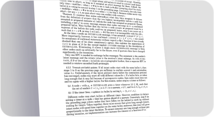 TheStellar Consensus Protocol 25 from each node without relying on timing to order the messages, since the network mayre-order messages. Afewdetailsoftheprotocolmeritexplanation.Thestatementsimpliedby PREPARE of the form “abort b¨ ∨ accept(abort b¨)” do not specify whether v is voting for or con- firming abort b¨. The distinction is unimportant for the definition of accept. Glossing over the distinction allows v to forget about old ballots it voted to commit (and hence cannot vote to abort), so long as it accepted an abort message for them. Indeed, the only time v modifies c when c ≠ 0 is to set it back to 0 after accepting abort for every ballot it is voting to commit in step 1 on the preceding page. Conversely, the only time v modifies c when c = 0 is to set it to a value c ≥ b in step 3. Because nodes never vote abort c for any c ≥ b, no past abort votes can conflict with commit c. Theorem 11 requires that nodes rebroadcast what they have accepted. It follows from the definition of prepare that the two highest incompatible ballots a node has accepted as prepared subsume all ballots the node has accepted as prepared. Hence, ¨ including p and p in every message ensures that nodes converge on ℎ—a confirmed prepared ballot. Note further that the ballots a node accepts as prepared must be a superset of the ballots the node confirms as prepared; hence, step 2 can never set ℎ such that ℎ ≁ c ≠ 0, as step 1 will set c ← 0 if the new ℎ is incompatible with the old c. ¨ ¨ At the time v sends an EXTERNALIZE message, it has accepted {commit b ∣ b ≳ c}. ¨ ¨ More importantly, however, it has confirmed {commit b ∣ c ≲ b ≲ ℎ}. v can assert its acceptance of confirmed statements without regard to Q(v), because it has already checked that one of its slices unanimously agrees; this explains the appearance of {{v}} in place of D for the second implicit CONFIRM message in the description of EXTERNALIZE. Eliminating D allows a single static EXTERNALIZE message to help other nodes catch up arbitrarily far in the future, even if quorum slices have changed significantly in the meantime. Only one RPC is needed to exchange ballot messages. The argument is the sender’s latest message and the return value is the receiver’s latest message. As with NOMI- NATE, if D or the values x in ballots are cryptographic hashes, then a separate RPC is needed to retrieve uncached hash preimages. 6.2.2. Timeouts and ballot updates. If all intact nodes start with the same ballot b, then steps 1 to 9 on the previous page are sufficient to confirm commit b and externalize value b.x. Unfortunately, if the ballot protocol starts before the nomination protocol hasconverged, nodes may start off with different values for z. If a ballot fails, or takes long enough that it may fail because of unresponsive nodes, then nodes must time out andtryagainwithahigherballot. For this reason, nodes employ a timer as follows: (a) A node v with ' ≠ EXTERNALIZE arms a timer whenever ∃S ⊆ M such that v v the set of senders U = {v ∣ m ∈ S } is a quorum, v ∈ U, and ∀m ∈ S, b .n ≥ b .n. m m v (b) If the timer fires, v updates its ballot by setting b ← ⟨b .n + 1,z ⟩. v v v Different nodes may start ballots at different times. However, condition (a) delays setting a timer at a node v that has gotten ahead of a quorum. Conversely, step 9 on the preceding page allows nodes that have fallen too far behind to catch up without waiting for timers. Taken together, these rules ensure that given long enough timers, intact nodes will spend time together on the same ballot; moreover, this time will grow proportionally to the timer duration. To ensure timeouts are long enough without pre- dicting latencies, an implementation can increase the timeout as a function of b.n. 6.3. Correctness AnSCPnodecannotvotetoconfirmcommitbuntilithasvotedtoconfirmabortforall lower-numberedincompatibleballots.Becauseawell-behavednodecannotaccept(and
