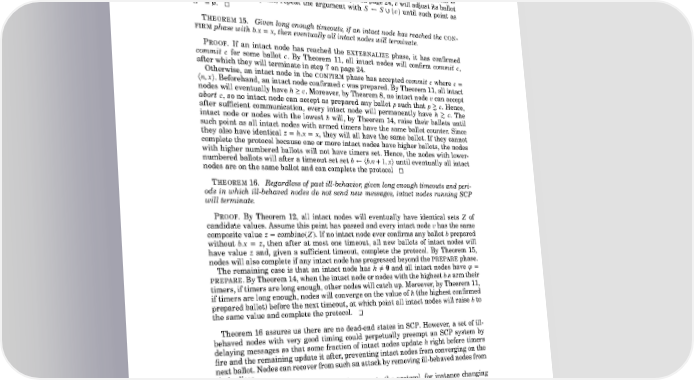 TheStellar Consensus Protocol 27 PROOF. LetS ={v∣bv ≥n}bethesetofnodeswithcountersatleastn.Byassump- tion, S contains an intact node. Furthermore, because that intact node armed its timer, S must also encompass a quorum. Let S+ be the intact subset of S, and S− be the set of intact nodes not in S. By Theorem 10, either S− = ç (in which case the theorem is trivial), or S+ is v-blocking for some v ∈ S. By step 9 on page 24, v will adjust its ballot so b .n ≥ n. At this point, repeat the argument with S ← S ∪ {v} until such point as − v S =ç. THEOREM15. Given long enough timeouts, if an intact node has reached the CON- FIRM phase with b.x = x, then eventually all intact nodes will terminate. PROOF. If an intact node has reached the EXTERNALIZE phase, it has confirmed commit c for some ballot c. By Theorem 11, all intact nodes will confirm commit c, after which they will terminate in step 7 on page 24. Otherwise, an intact node in the CONFIRM phase has accepted commit c where c = ⟨n,x⟩. Beforehand, an intact node confirmed c was prepared. By Theorem 11, all intact nodes will eventually have ℎ ≥ c. Moreover, by Theorem 8, no intact node v can accept abort c, so no intact node can accept as prepared any ballot p such that p ⋧ c. Hence, after sufficient communication, every intact node will permanently have ℎ ≳ c. The intact node or nodes with the lowest b will, by Theorem 14, raise their ballots until such point as all intact nodes with armed timers have the same ballot counter. Since they also have identical z = ℎ.x = x, they will all have the same ballot. If they cannot complete the protocol because one or more intact nodes have higher ballots, the nodes with higher numbered ballots will not have timers set. Hence, the nodes with lower- numberedballots will after a timeout set set b ← ⟨b.n+1,x⟩ until eventually all intact nodes are on the same ballot and can complete the protocol THEOREM16. Regardlessofpastill-behavior, given long enough timeouts and peri- ods in which ill-behaved nodes do not send new messages, intact nodes running SCP will terminate. PROOF. By Theorem 12, all intact nodes will eventually have identical sets Z of candidate values. Assume this point has passed and every intact node v has the same composite value z = combine(Z). If no intact node ever confirms any ballot b prepared without b.x = z, then after at most one timeout, all new ballots of intact nodes will have value z and, given a sufficient timeout, complete the protocol. By Theorem 15, nodeswill also complete if any intact node has progressed beyond the PREPARE phase. The remaining case is that an intact node has ℎ ≠ 0 and all intact nodes have ' = PREPARE.ByTheorem14,whentheintactnodeornodeswiththehighestb.narmtheir timers, if timers are long enough, other nodes will catch up. Moreover, by Theorem 11, if timers are long enough, nodes will converge on the value of ℎ (the highest confirmed prepared ballot) before the next timeout, at which point all intact nodes will raise b to the same value and complete the protocol. Theorem 16 assures us there are no dead-end states in SCP. However, a set of ill- behaved nodes with very good timing could perpetually preempt an SCP system by delaying messages so that some fraction of intact nodes update ℎ right before timers fire and the remaining update it after, preventing intact nodes from converging on the nextballot. Nodescanrecoverfromsuchanattackbyremovingill-behavednodesfrom their slices. An alternative would be to add randomness to the protocol, for instance changing step 2 on page 24 to update z with probability 1∕2 (or even with probability propor- tional to the fraction of the timer remaining). Such an approach would terminate with