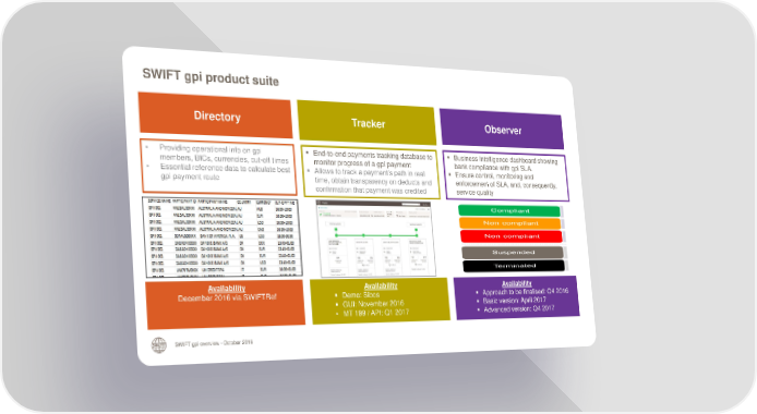 SWIFT gpi product suite Directory Tracker Observer • Providing operational info on gpi End-to-end payments tracking database to Business Intelligence dashboard showing members, BICs, currencies, cut-off times monitor progress of a gpi payment bank compliance with gpi SLA. • Essential reference data to calculate best Allows to track a payment’s path in real Ensure control, monitoring and gpi payment route time, obtain transparency on deducts and enforcement of SLA, and, consequently, confirmation that payment was credited service quality Availability Availability Availability December 2016 via SWIFTRef Demo: Sibos Approach to be finalised: Q4 2016 GUI: November 2016 Basic version: April 2017 • MT 199 / API: Q1 2017 Advanced version: Q4 2017 SWIFT gpi overview - October 2016